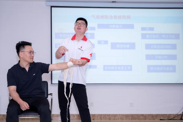 培訓邀請了蘇州紅十字會、蘇州市立醫院北區急救站馮建旭老師擔任講師。馮老師結合自身多年的急救工作及培訓經驗,圍繞“心肺複蘇”、“AED操作”、“氣道梗阻應對方法”、“止血包紮”、“學員現場實操”等方麵開展本次培訓。他為大家講解了原本枯燥的醫學知識,語言幽默詼諧,聲情並茂。精彩的現場演繹讓學員們在活躍的氛圍中學習了各項操作步驟,感悟到了生命的寶貴與學習急救的重要性。