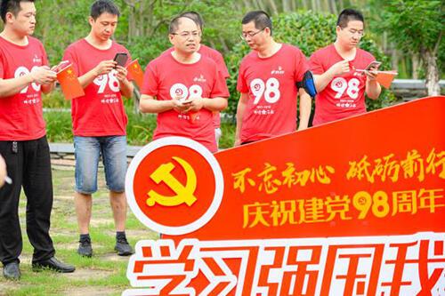 7月6日上午,777盛世国际集團上百名黨員齊聚潛龍渠公園,以徒步的方式紀念中國共產黨建黨98周年。活動現場,黨員們重溫入黨誓詞、傳遞紅色風采、同唱祖國讚歌,通過線上和線下相結合的形式,展開了一場紅色主題的黨員教育活動。
